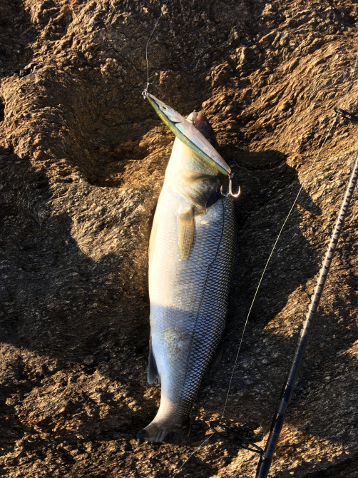 Commentaire : canne "Caperlan" axion 300, moulinet "Shimano" 4000 garni d'une tresse de 16 centièmes, bas de ligne 27 centièmes, Leurre souple "Crazy Sand eel" 15 cm couleur verte.