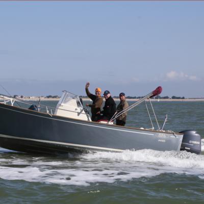 À 9h30, Yannick Deslandes, guide de pêche local, briefe les participants -qu’il accompagnera tout au long de la journée pour leur donner des conseils et partager avec eux son expérience- avant le départ, et définit enfin une zone de mouillage circulaire au Sud de l’île de Ré en face de l’anse du Martray et du phare de Charchardon.